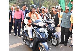 मुख्यमंत्री श्री साय ने सड़क सुरक्षा का संदेश देते हुए स्वयं हेलमेट पहनकर बाइक चालकों के दल के साथ स्कूटी चलाई।कार्यक्रम में मुख्यमंत्री श्री साय ने राजधानी रायपुर के पंडरी में आधुनिक लाइसेंस सेंटर कार्यालय भवन पंडरी का भूमिपूजन और प्रदेश भर में मुख्यमंत्री ग्रामीण बस योजना के तहत 12 नवीन मार्गों में 12 नवीन बसों का शुभारंभ किया।