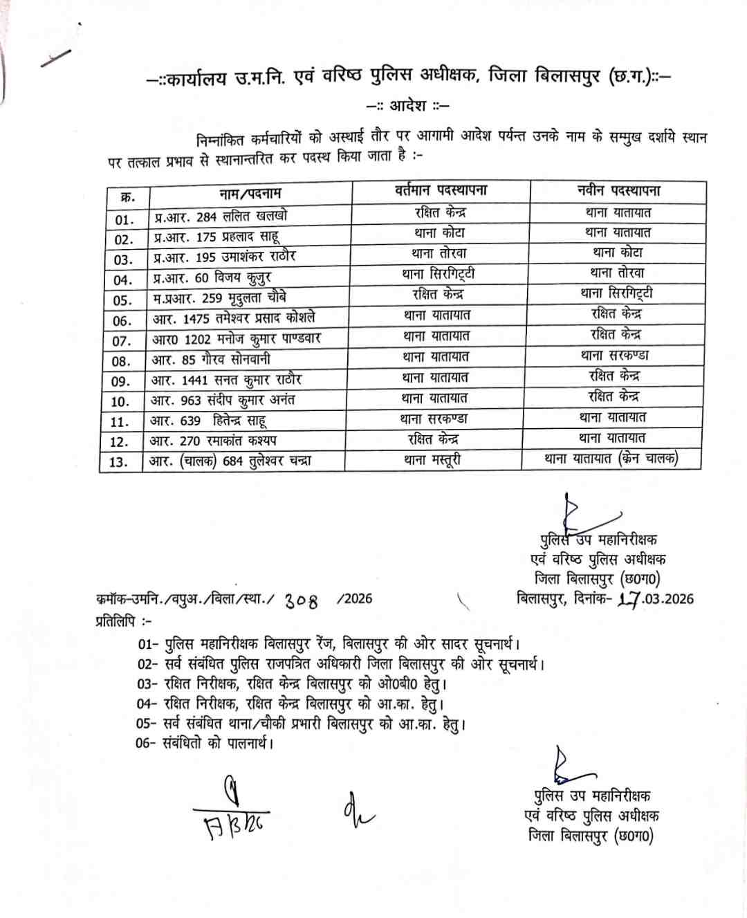 बिलासपुर. डीआईजी व एसएसपी रजनेश सिंह नए स्टेनो 1की पदस्थापना के साथ प्रधान आरक्षको और आरक्षको का फिर से तबादला आदेश जारी किया है।