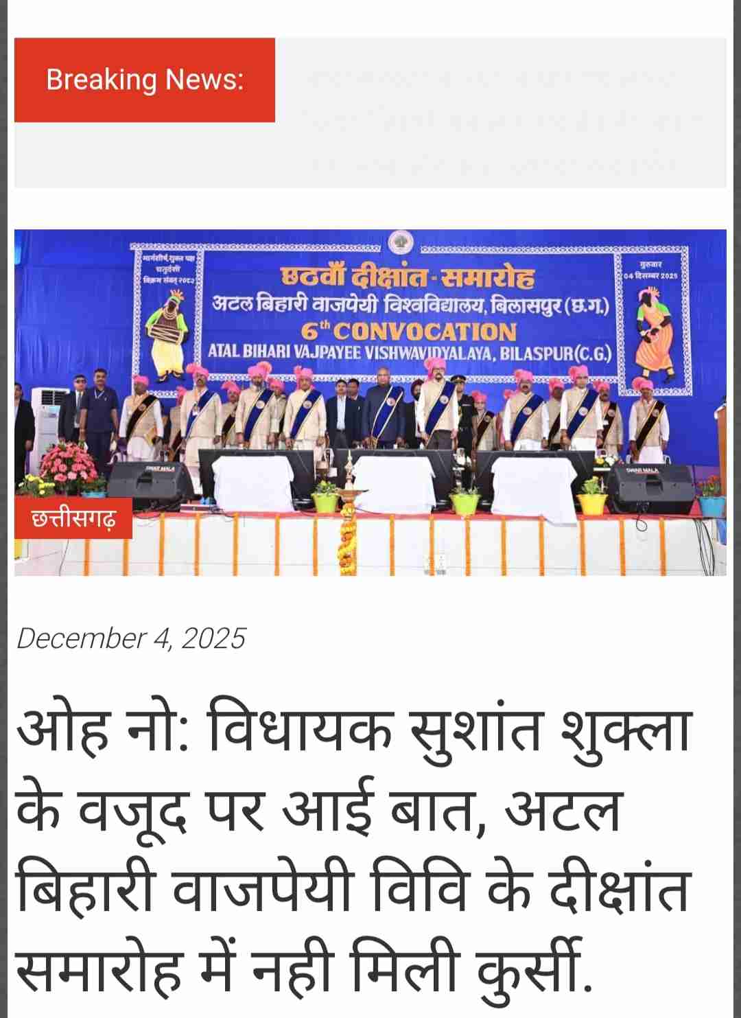 बिलासपुर. ओह्ह नो: विधायक सुशांत शुक्ला के वजूद पर आई बात, अटल बिहारी वाजपेई विश्वविद्यालय के दीक्षांत समारोह में नहीं मिली कुर्सी .. के शीर्षक की खबर ' OMG NEWS ' में अपडेट होने के बाद सत्ताधारी दल के युवा विधायक की हो रही किरकिरी के कुछ ही देर बाद विधायक शुक्ला ने बड़ी शालीनता से अपना पक्ष रखा है।