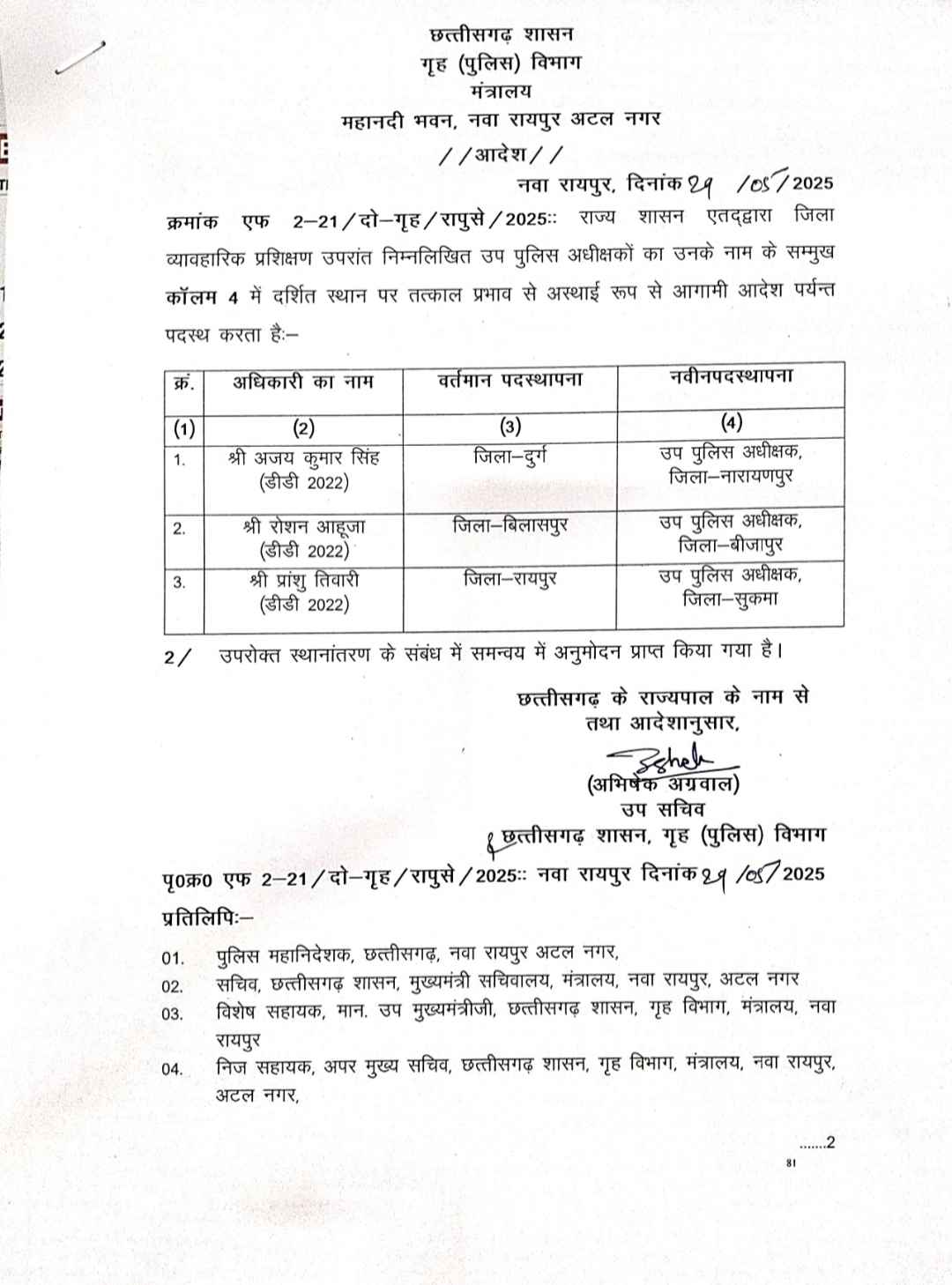 रायपुर. राज्य शासन ने 2022 बैच के तीन डीएसपी का तबादला आदेश जारी किया है। गृह मंत्रालय द्वारा बेक डेट में जारी इस आदेश के अनुसार डीएसपी अजय कुमार, रोशन आहूजा और प्रांशु तिवारी का नाम इस लिस्ट में शामिल है। जिन्हें क्रमशः जिला नारायणपुर , बीजापुर और सुकमा की तैनाती दी गई है।
