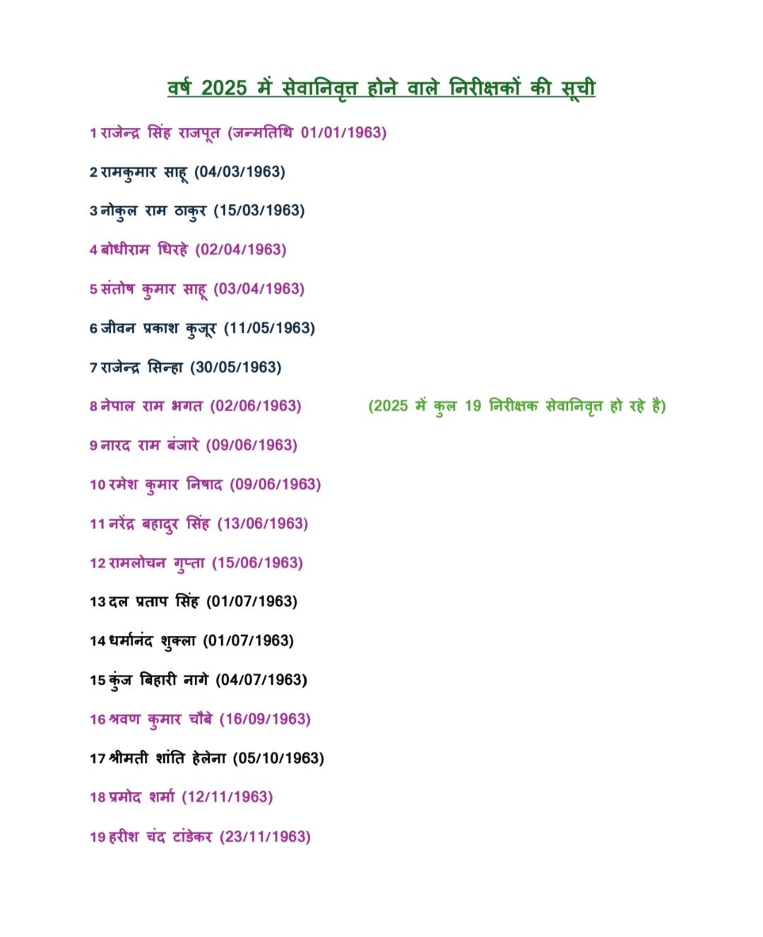 मिल रही जानकारी के अनुसार वर्ष 2025 में पुलिस विभाग 19 टीआई विभाग से रिटायर्ड होने वाले हैं। बिना किसी सील साइन के प्राप्त हुई एक लिस्ट के अनुसार उक्त जानकारी सामने आई है।