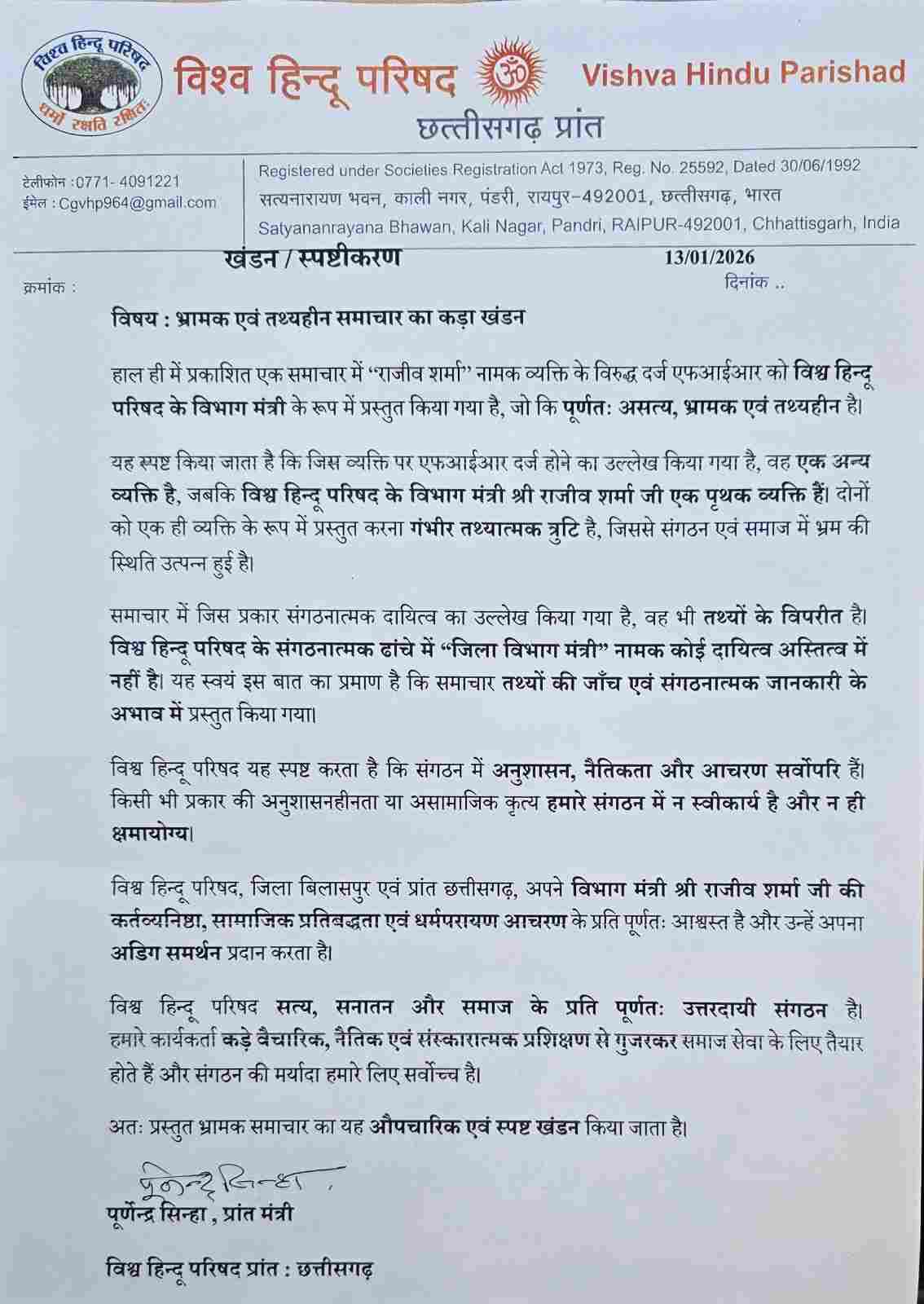आरोपी राजीव शर्मा की गिरफ्तारी के बाद शहर में चर्चा तेज हो गई आरोपी हिंदू संगठन ( विश्व हिंदू परिषद - बजरंग दल) से जुड़ा है। उसे हिंदू संगठन का विभाग मंत्री बताया जा रहा था। इस मसले में विश्व हिंदू परिषद का नाम सामने आने के बाद फजीहत शुरू हो गई। जिसके बाद विहिप के श्री सिन्हा प्रांत मंत्री के हस्ताक्षर जारी हुआ एक खंडन, स्पष्टीकरण पत्र सोशल मिडिया पर जारी हुआ जिसमें बलात्कार के आरोपी राजीव शर्मा को विहिप संगठन का न होना करार दिया गया।