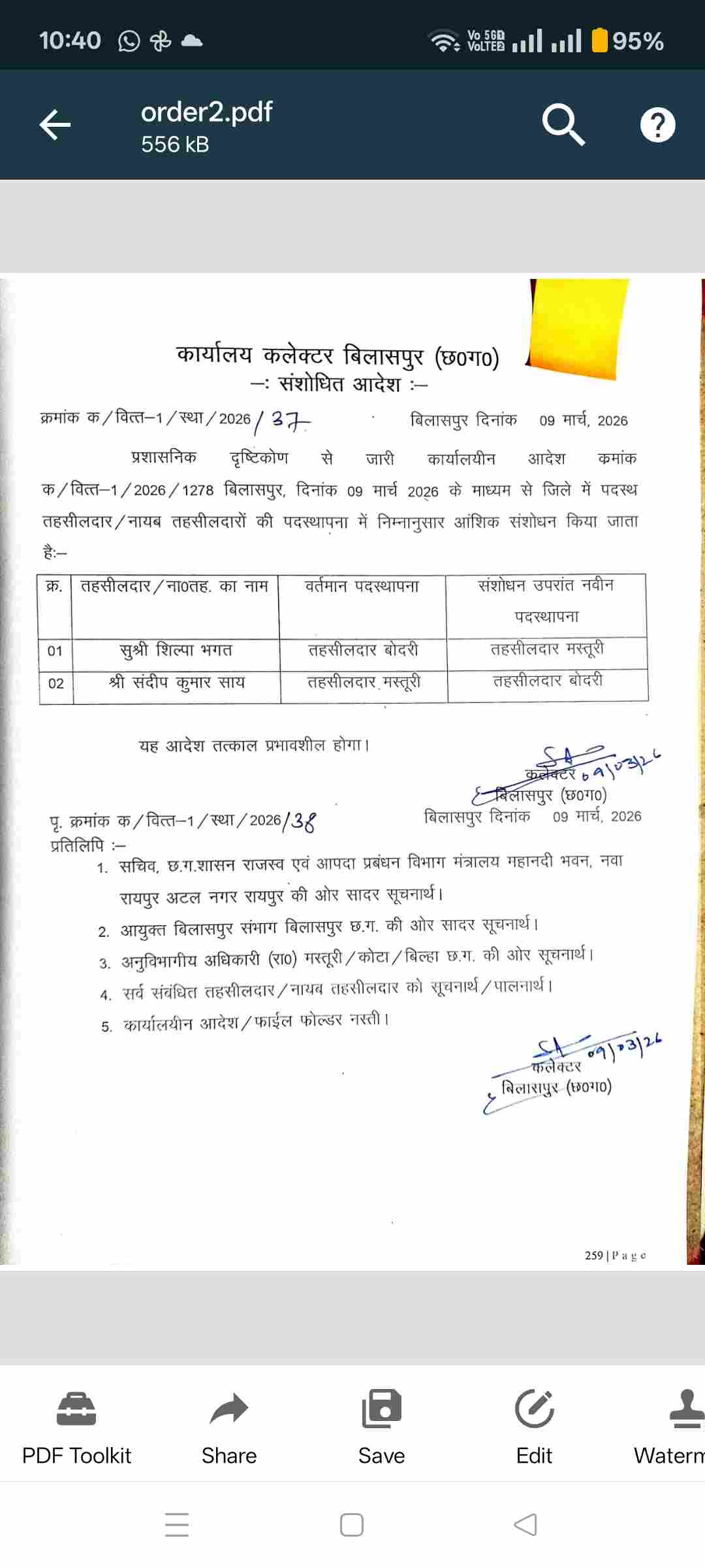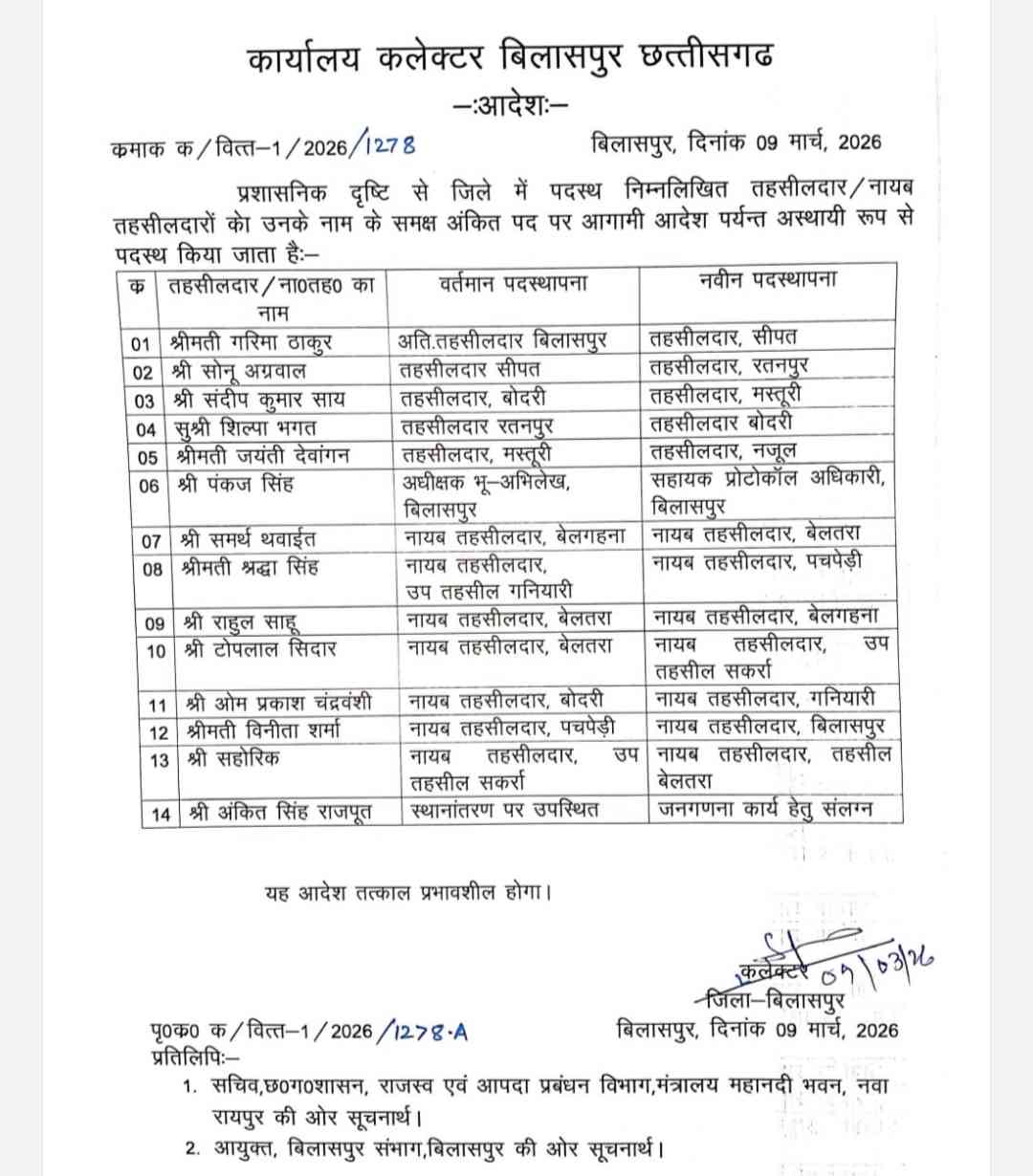 इधर तबादला आदेश के मुताबिक महिला तहसीलदार सुश्री शिल्पा भगत को रतनपुर से बोदरी तहसील का चार्ज दिया गया था लेकिन देर शाम कलेक्टर का आदेश पलट गया और एक नया आदेश जारी कर तहसीलदार संदीप कुमार साय को बोदरी में यथावत रख सुश्री शिल्पा भगत को मस्तूरी तहसीलदार (नजूल शाखा) में शिफ्ट किया गया है।